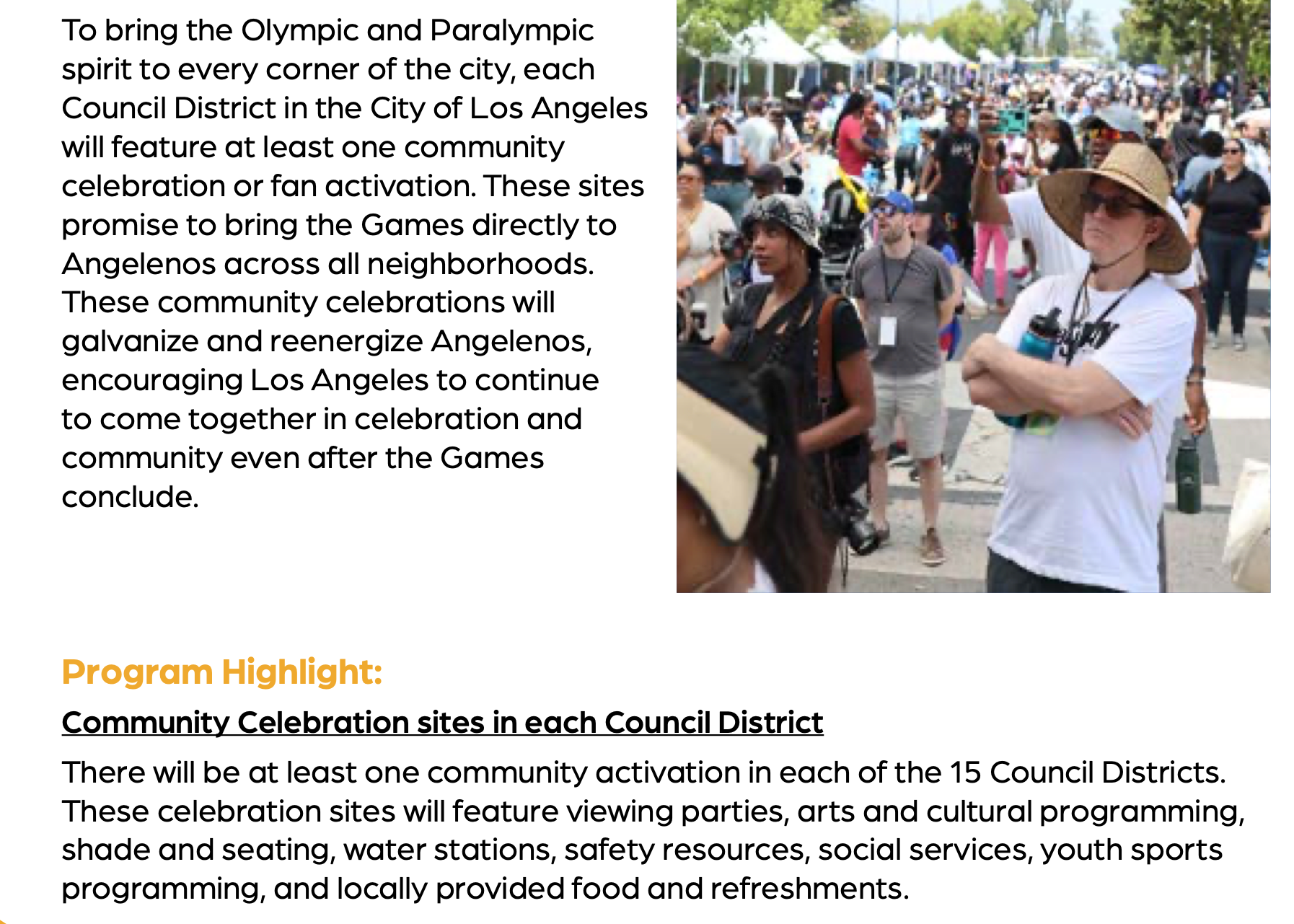 ONE? PER COUNCIL DISTRICT? I know, it does say "at least," but that's what we're currently planning for? 15 activations? This number is clearly derived from Paris, which sited one official celebration zone per arrondissement, with 180 total across France. But that's 20 sites for a 41-square-mile city compared to 15 sites for a 500-square-mile city! If we're truly planning "across all neighborhoods," how about at least one community celebration in each of LA's 99 neighborhood council districts?