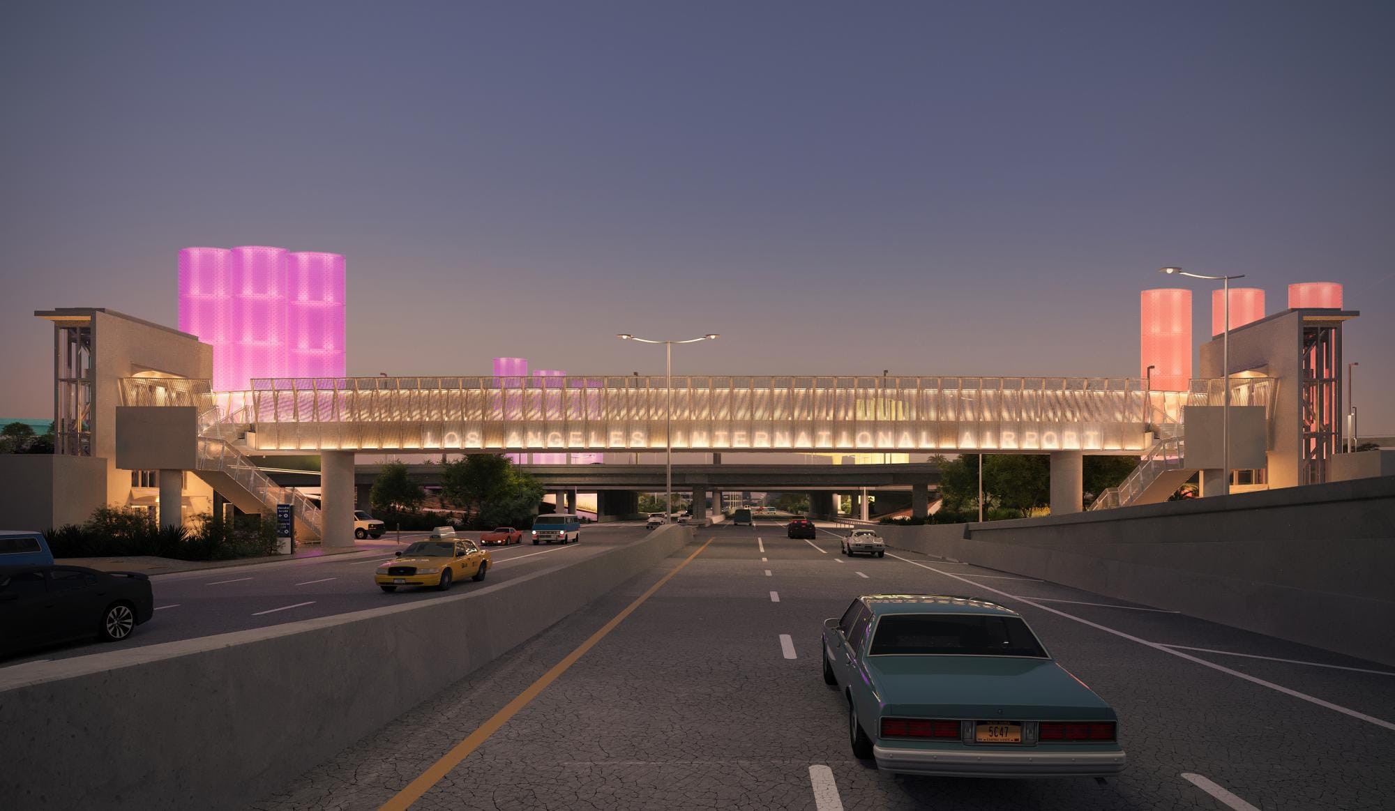 When I flew out of LAX last weekend — FlyAway both ways worked like a dream, please add more! — I noticed something else wrong with this plan. By mucking up the surface streets, people walking near the airport will be forced up and over the elevated roadways on a series of pedestrian bridges. This will also obliterate Paul Tzanetopoulos's untitled pylon installation (which looked like this) at the airport's entrance. The "LAX" has already been removed from its current location!