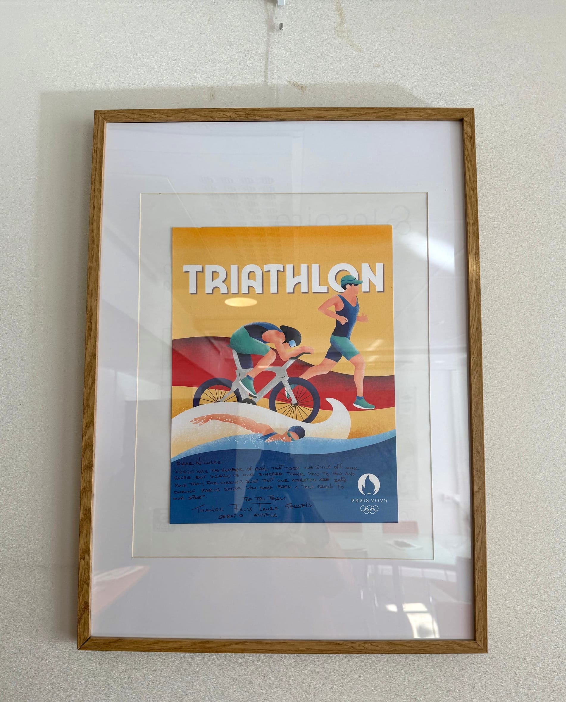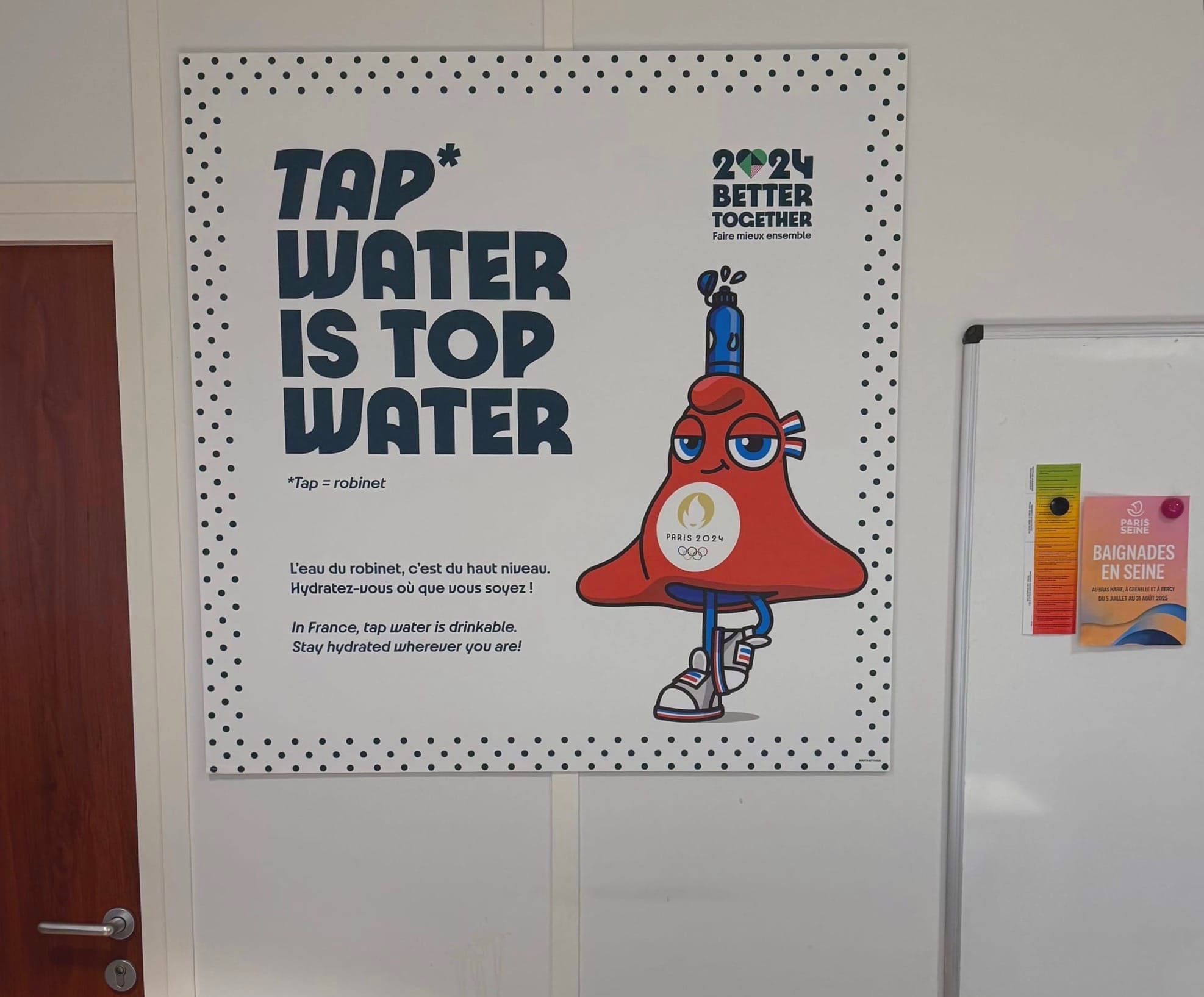 "Without the Olympics, we couldn't achieve this," said Nicolas Londinsky, director of Paris's water and sanitation department, as we stood in his office in the 14th arrondissement. Posters from 2024 lined the walls, with my personal favorite showing the mascot Phryge touting the potability of the city's tap water: C'est du haute niveau! In Londinsky's office, an autographed poster from Olympic and Paralympic triathlon technical advisors thanks the city's department for making the water safe for them to compete, cheekily noting the target E. coli levels.