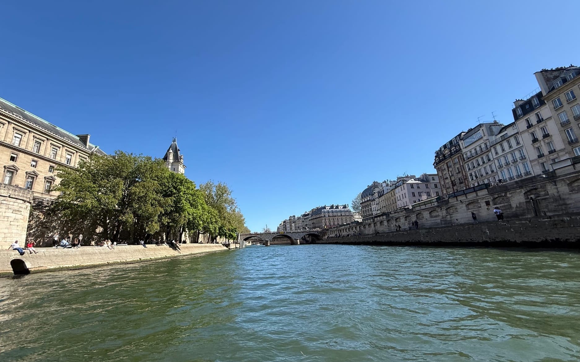 Our river cruise started beyond the western edge of the city, where the Seine curves into a U encircling the Bois de Boulogne. We jetted past primary-colored high-rise apartment towers, houseboats sprouting spring greenery, barges distributing building materials to be transported to construction sites by water. As the Eiffel Tower loomed into sight, I saw a familiar spot I'd recognized from photos: the location of Bras Grenelle, one of three places in the city where the river had been opened for public swimming last summer for the first time in a century — perhaps the most audacious legacy of Paris's 2024 games.
