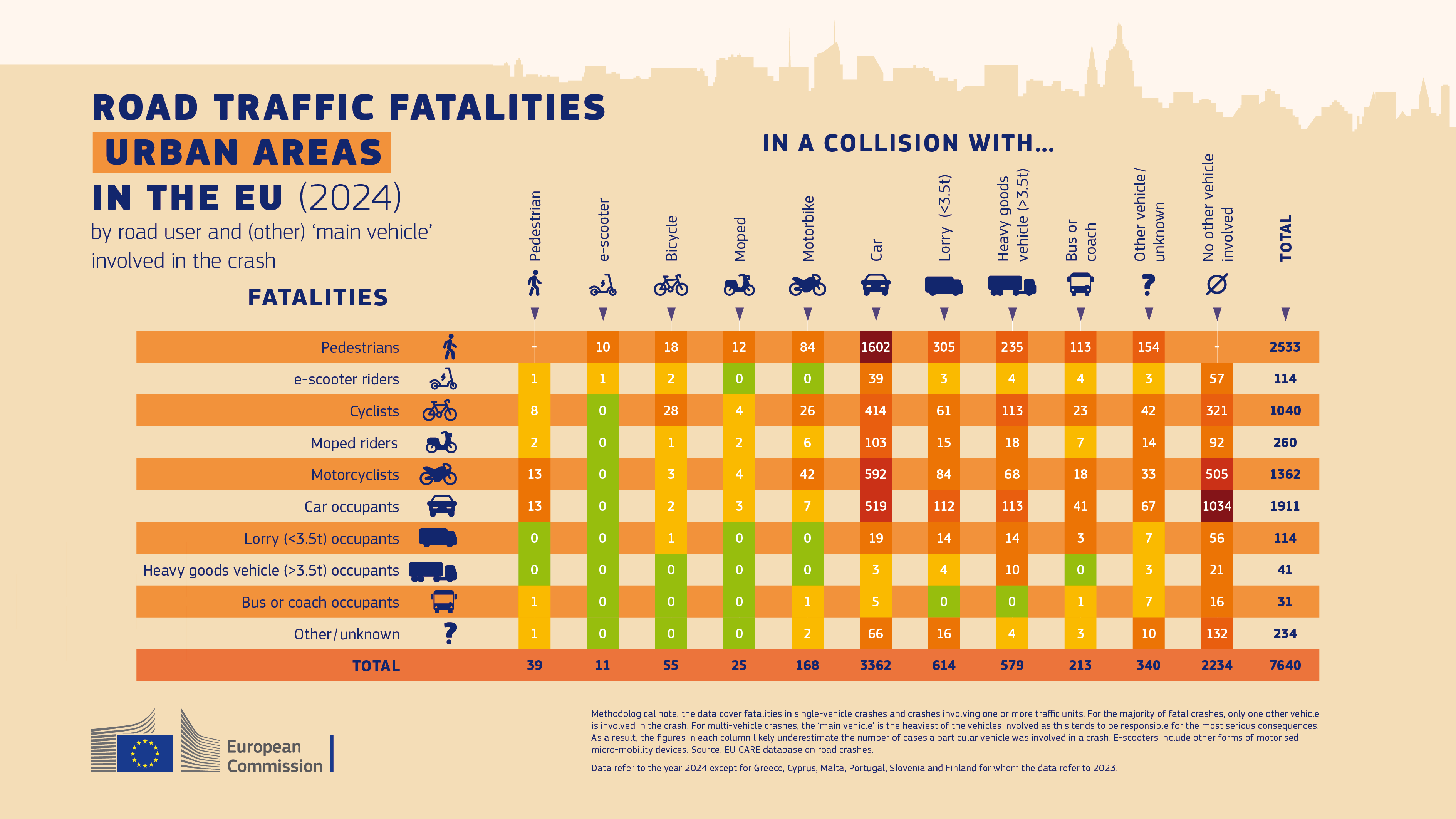 While most of the Parisians I know have embraced the changes, some will tell you the explosion of bikes makes streets feel dangerous in a different way. In response, I love to share this matrix, part of the European Commission's annual road deaths report, as it helps to viscerally envision what causes a fatal collision on an urban street. The only takeaway you can possibly construe from this data is that the key to making cities safer is by getting people out of cars and onto literally any other mode — including the extremely underrated aspect of saving drivers from... themselves?