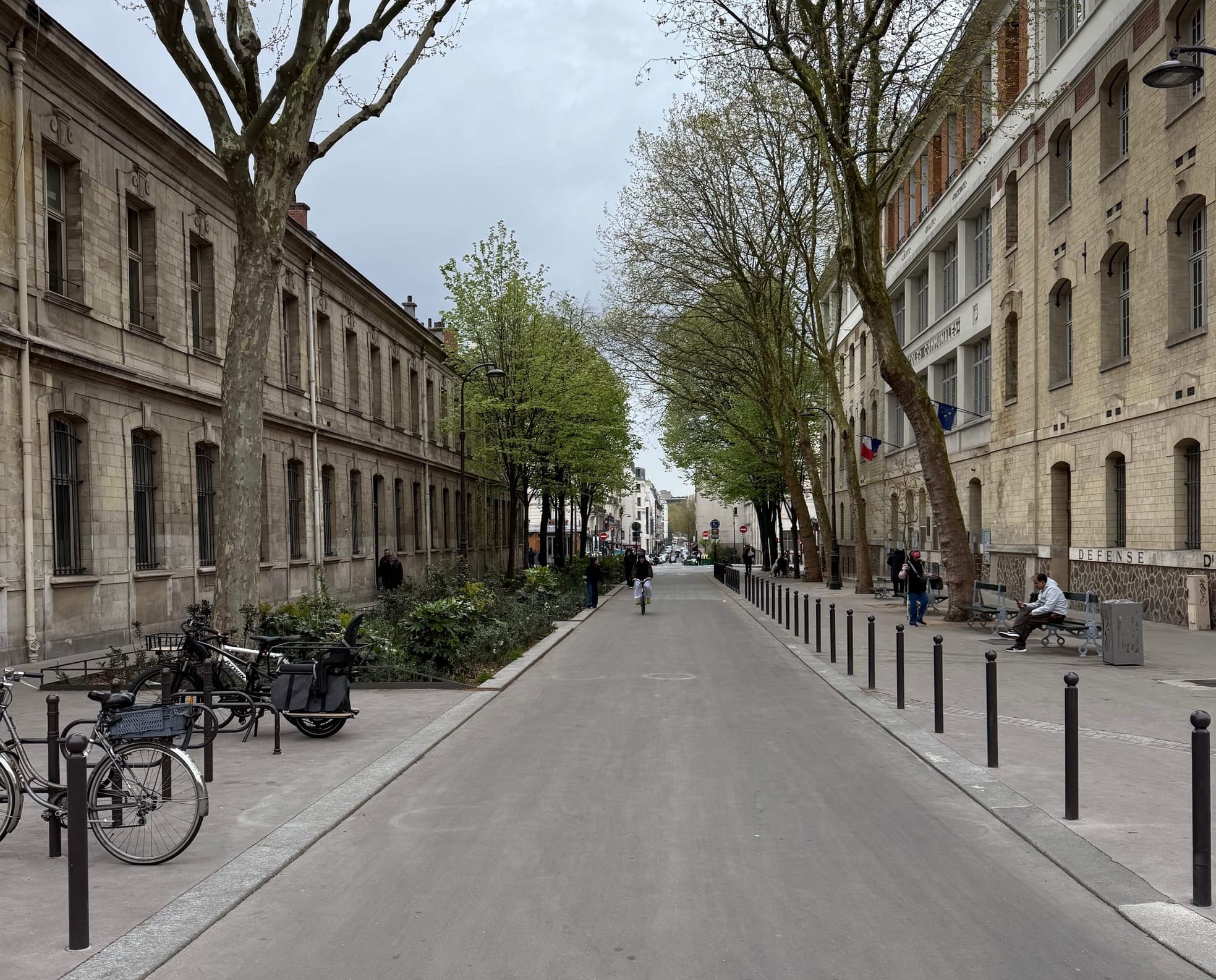 But the most important place that Paris has done all of this work is in front of its schools. Since 2020, the city has installed over 300 rues aux écoles which I had to stop and photograph pretty much every time I saw one. Closing a street to cars immediately adjacent to a school delivers a myriad of obvious safety benefits, and on top of that, Paris's version perfects the triple whammy to combat pollution that Moran describes: fewer cars, less pavement, and more trees. But these school streets are also effective at cooling down the neighborhood. Armed with a thermal camera, Moran spent last summer visiting 272 school streets and found that ones with the full treatment — trees, gardens, light-colored pavement — were on average, an astonishing 9 degrees (Fahrenheit) cooler than nearby non-school streets, a differential that even Moran was unprepared for. This summer, Moran will be investigating how much the parked cars on the non-school streets serve as heat amplifiers in the surrounding area — and as someone who's been burned by a Subaru on a 95-degree day I think I can make an educated guess about that outcome.