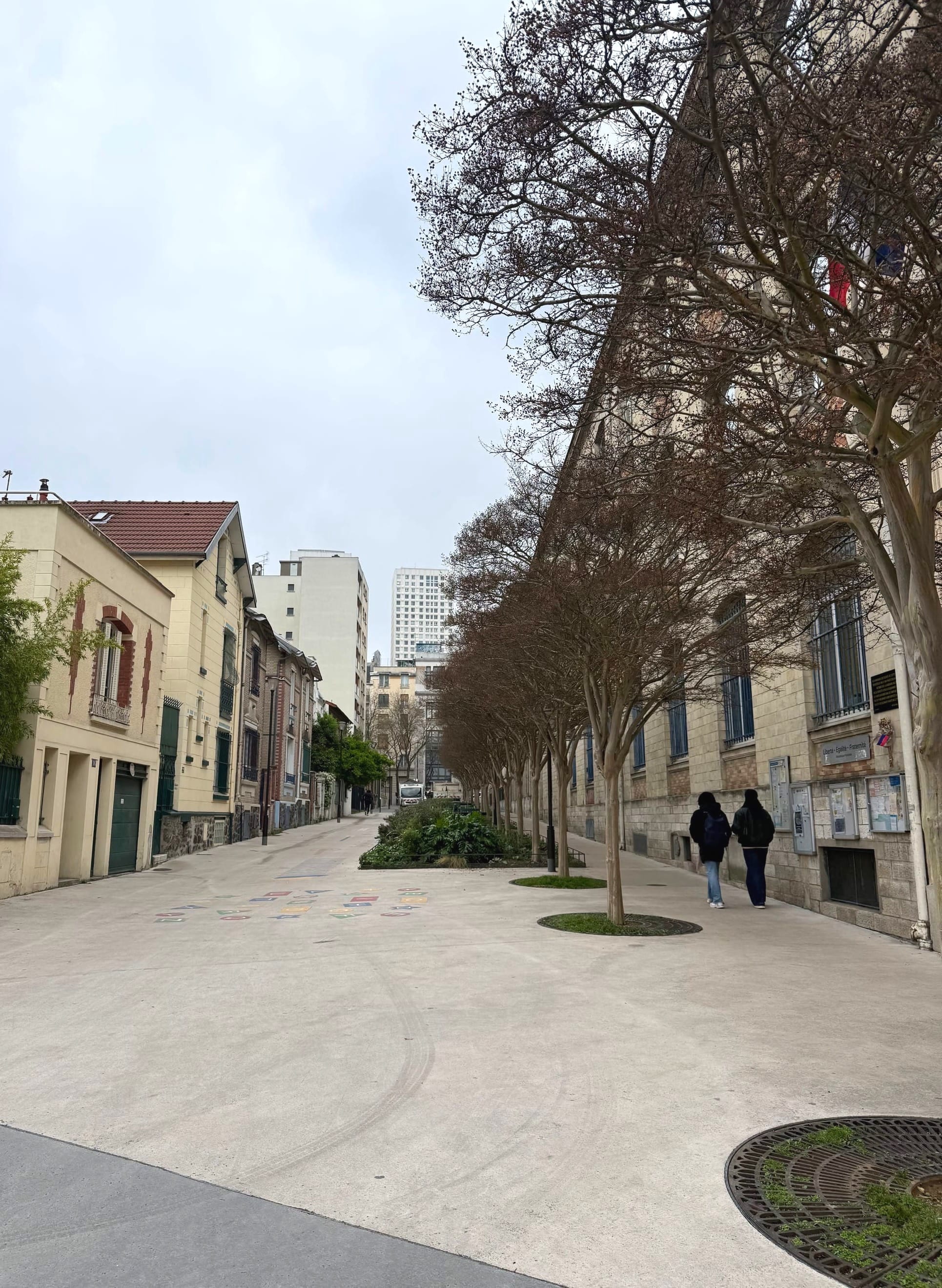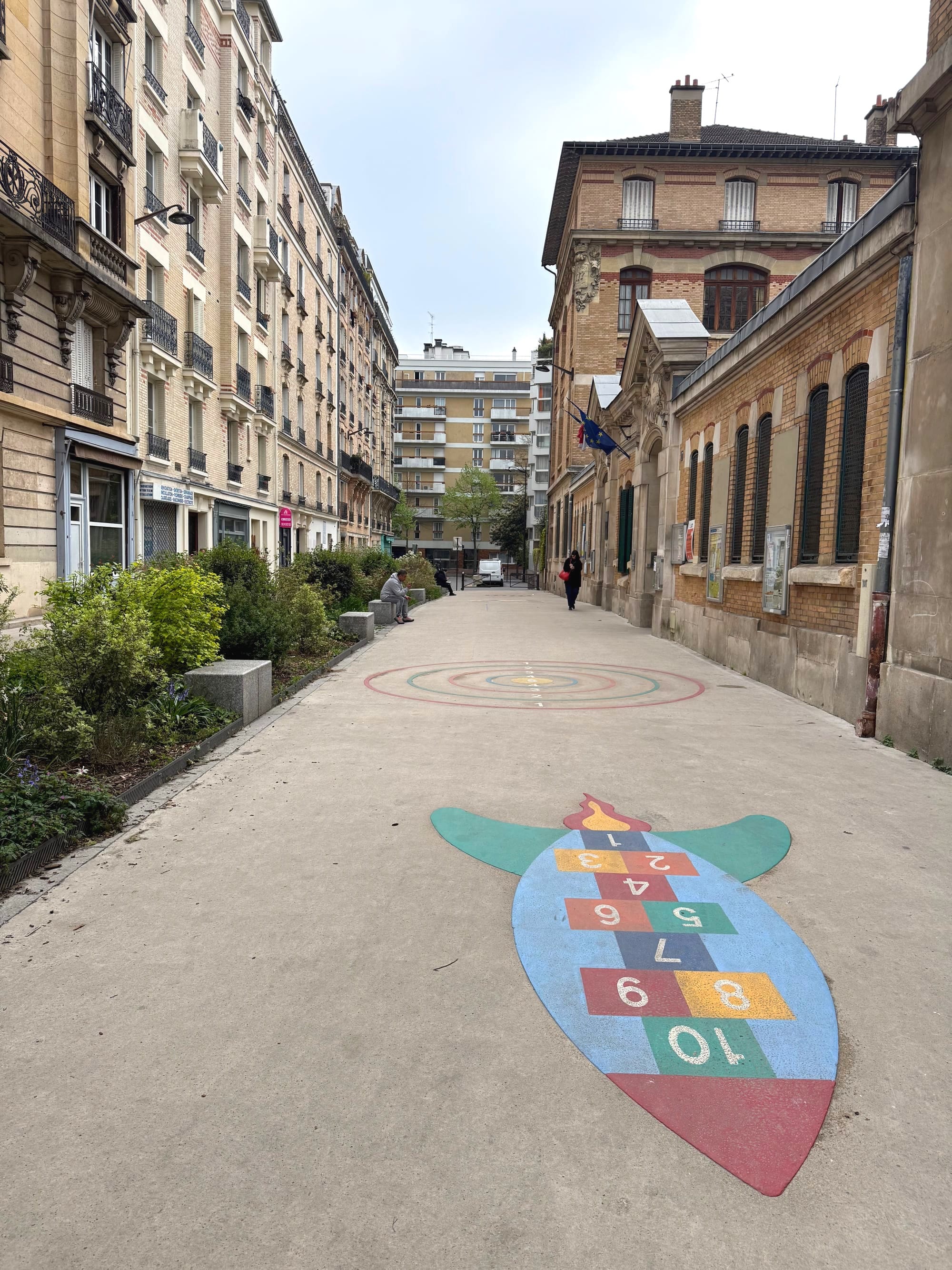 As it turned out, there was another LAUSD mom who thinks a lot about heat and kids who was in Paris at the same time as me, and we met up on the southeast edge of the city to tour as many school streets as we could cram into an afternoon. UCLA associate professor of urban planning and geography V. Kelly Turner has long been my go-to expert when it comes to depaving and shading our asphalt schoolyards, which, as I learned from her research, are often the hottest places in LA neighborhoods. Turner was there to meet with Paris officials to hear more about the success of these projects as LAUSD struggles to cool its schools and LA struggles to cool its streets. As each school street came into view, we'd get giddy spotting the amenities. Some are just gates, but most have trees, gardens, benches, and hopscotch graphics. Others had more comprehensive seating, cargo bike racks, even drinking fountains with little misters atop them. Many were co-located next to parks, maximizing their benefits. Some had stores and cafés inside the gates, with chairs spilling out into the awninged plazas. On a hot day, we imagined heading towards the nearest school, knowing you'd find a guaranteed place for rest and respite — the exact opposite of the way we think about LA's schools now.