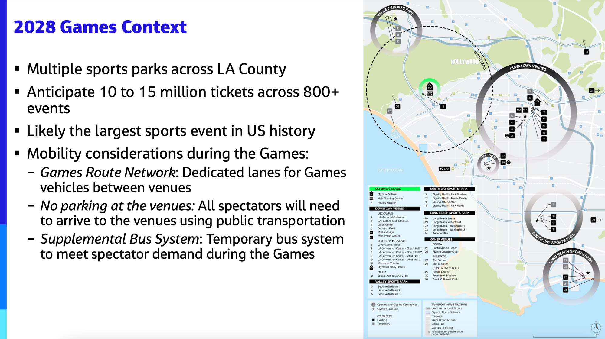 What Metro's now planning for 2028 borrows from the ExpressLanes concept. The proposed Games Route Network is a series of dedicated lanes connecting venues all over the city where vehicles carrying Olympic-related passengers can easily zip around LA. The lanes are necessary to make sure the Olympics actually happen — "if athletes can't get to the event, there are no games," one Metro presentation warns — and can also help keep our temporarily beefed-up bus fleet out of traffic. Particularly on freeways, where 80 percent of the network is located, these temporary lanes will function as something LA could really use on a typical Friday afternoon: a countywide dedicated lane network. On the freeways, these lanes could be hypothetically converted into everyday ExpressLanes by September 1, 2028.