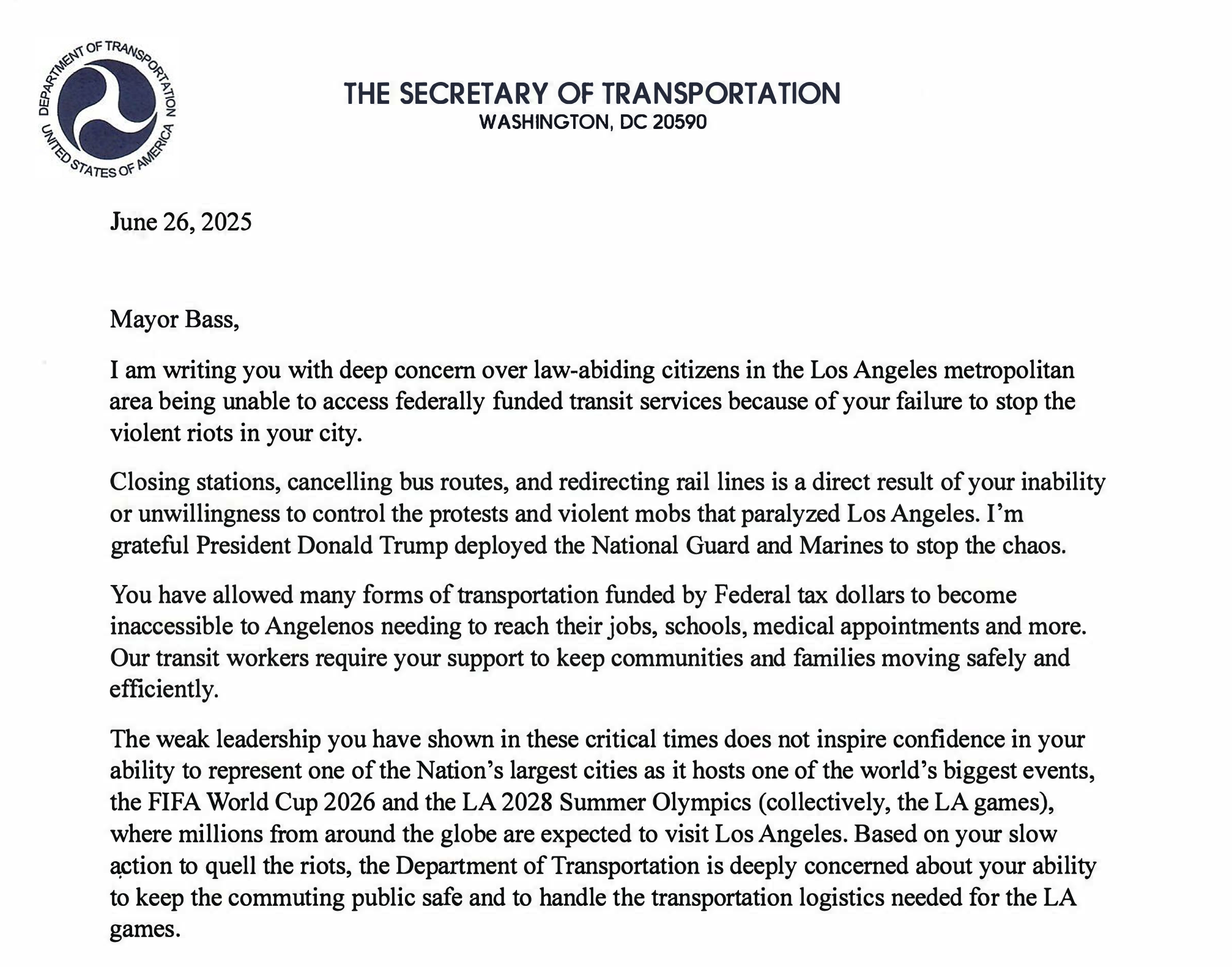 One would imagine that Transportation Secretary Sean Duffy has enough real-world problems to handle without having to invent new fake crises. But that's exactly what he did Thursday when he dispatched two letters to Los Angeles, one addressed to Mayor Karen Bass and one addressed to Metro CEO Stephanie Wiggins. In them, the Road Rules: All Stars cast member tries to infer that Metro's service disruptions during anti-ICE protests prove that LA is unfit to host upcoming megaevents. "Based on your slow action to quell the riots," he tells Bass, "the Department of Transportation is deeply concerned about your ability to keep the commuting public safe and to handle the transportation logistics needed for the LA games."