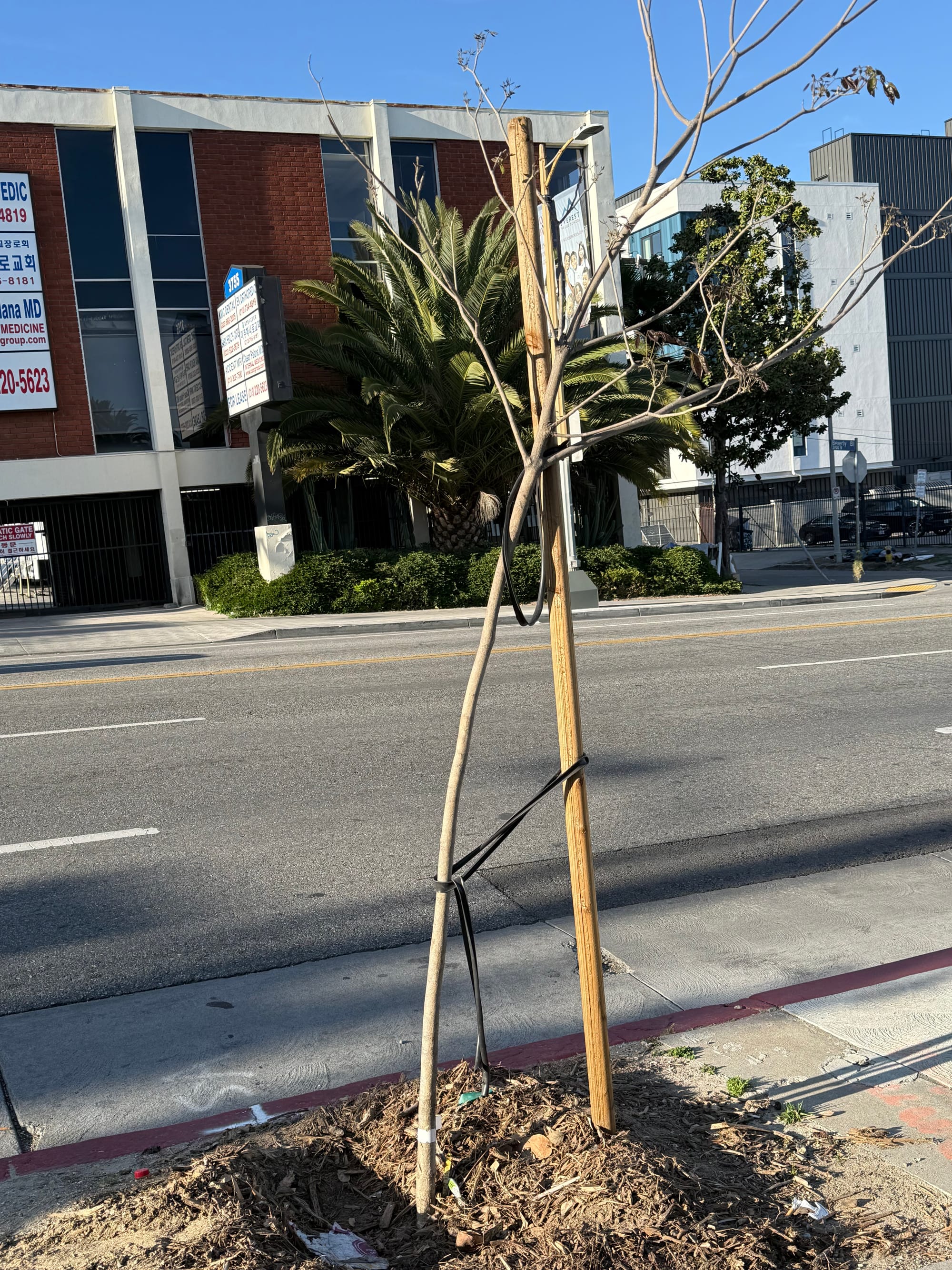 But planting the tree is only the first small step. In this budget crisis era, LA still needs someone — a billionaire mall developer who wants to help LA recover from a disaster? a large nonprofit holding a major event here in three years? — to protect these trees once they're in the ground, for at least three or four years until they get established, and ideally, long after that. One year ago, I wrote about a pair of tree wells in my neighborhood where two gargantuan ficuses had been cut down — not by a chainsaw-wielding tree vandal, but by municipal workers repairing the sidewalk. Over the next five years, the city tried to replant the tree wells twice. All four trees died. Last year, I wrote, I finally thought a new pair of pink trumpet trees were going to make it. Then, a few months ago, I noticed that these trees were gone too. It was not on the local news. There was no statement from the mayor. But for the people who wait for the bus on that corner, it remains an emergency. 🔥