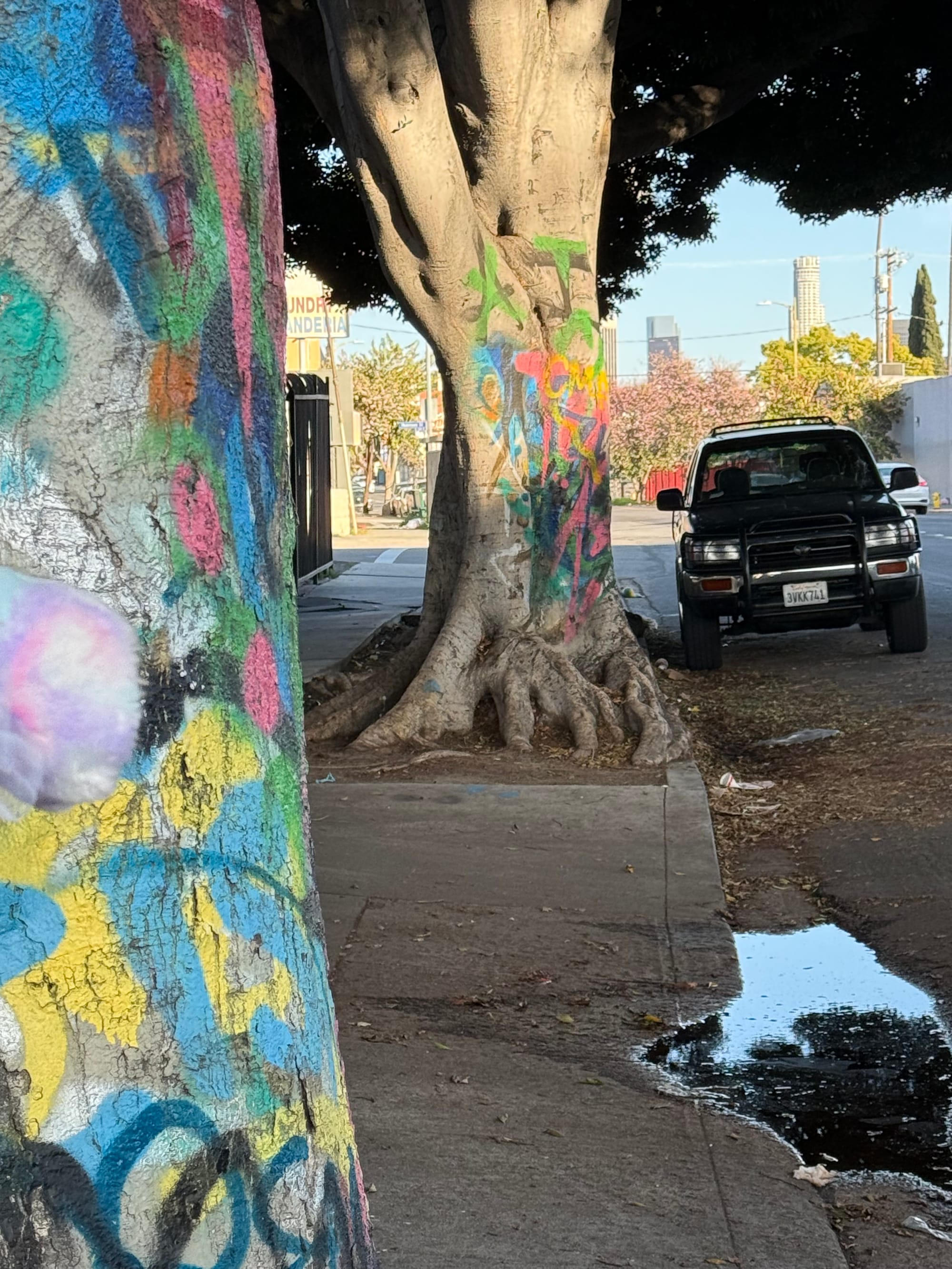 I know the term because I've filed more than a few such requests on the city's 311 app. (Yes, there's a new app, and I'll be writing about it soon; I've been inputting some more challenging service requests to test how well it works.) In the last few weeks, I've reported a dead purple orchid tree shedding limbs on the sidewalk, a block of freshly planted desert willows that were leaning precariously after their stabilizing stakes had been removed, and perhaps most troubling, a set of three ficuses with their trunks layered in graffiti. I honestly don't even know how you triage that type of tree emergency. But I may not get to find out. So far, none of these tree emergencies have been addressed by city workers.