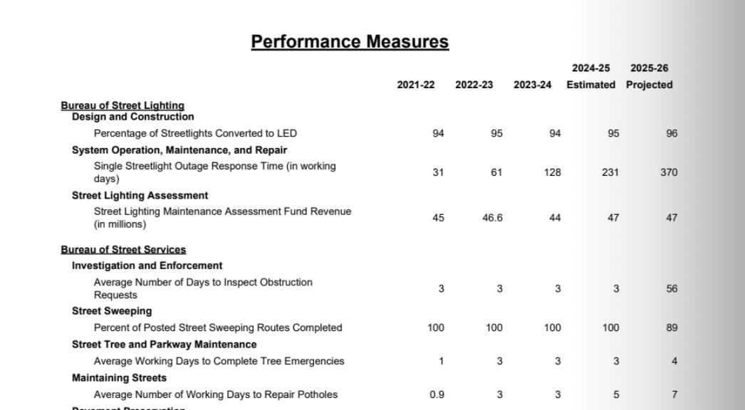 When I read the city's 500-page budget each year — I'm a lot of fun at parties — the section I immediately turn to is "performance measures." It's one of the few places where you can easily see how the way the city invests money translates into real metrics that affect your day-to-day life. On this week's LA Podcast episode, you can hear me take a deep breath as I read how long it will take city workers to address a single streetlight outage under this proposed budget: 370 days, up from only 31 days in 2021.