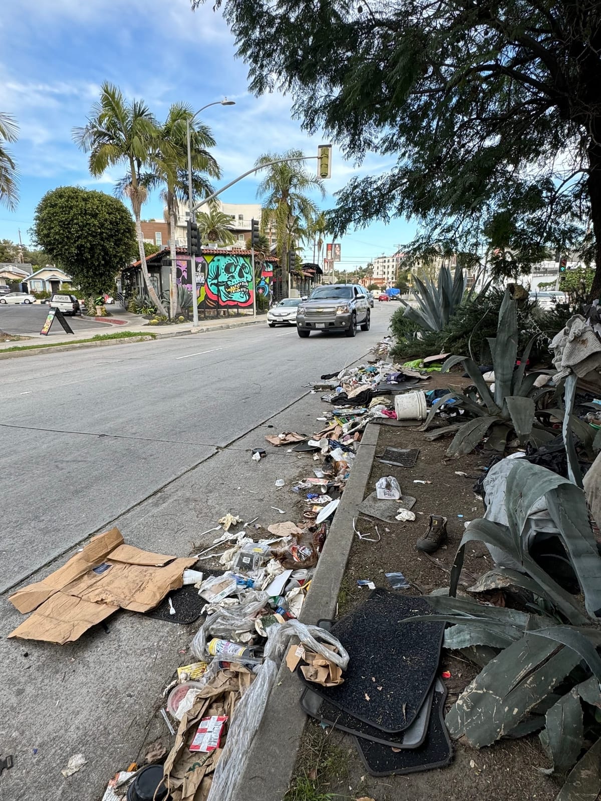 What made me sad, as always, was the state of the park itself. We use Lafayette Park fairly frequently, and, like most LA parks in a city facing a budget crisis, general upkeep seems to be a challenge: patchy grass, crumbling infrastructure, and so much trash. The ground inside the activation crunched beneath my feet with broken glass and Corona bottlecaps. Torched readers know we never blame our hardworking city employees for the fiscal decisions of our elected officials; park staff is doing their best with no resources. But I kept thinking about how the park's playground was burned down last year and it took months for the city to replace such a basic amenity in the most densely populated neighborhood in LA. When I went by the park later this week, the New Balance logos were painted over and the branded backboards were gone, but the courts themselves still looked great. However, the rest of the park wasn't necessarily in any better shape.