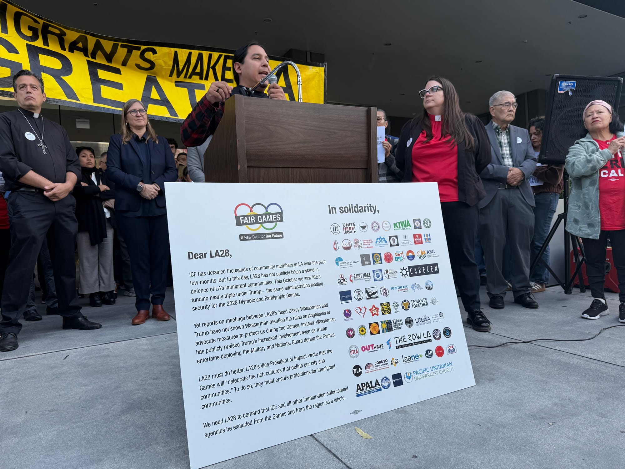 The workers were joined by a dozen local faith leaders, who spoke emotionally about how immigration raids had affected their communities, and at one point clasped hands to pray that LA28 organizers are planning an event "that makes us truly proud to be Angelenos, in a way that brings goodness and hope to all the inhabitants of this city." But the prayers were cut short as a security guard accused the group of trespassing and threatened to call law enforcement.